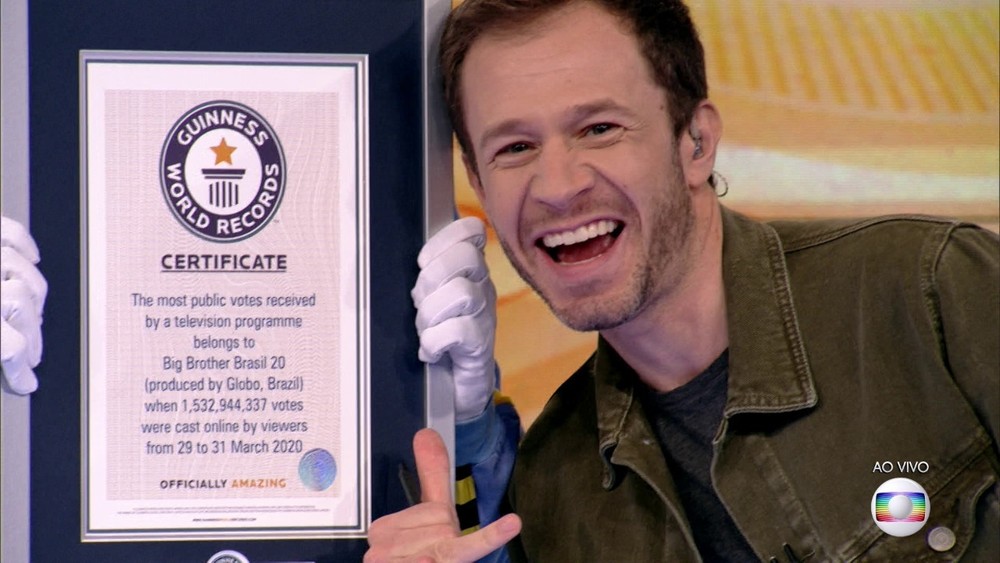 O 10º paredão do BBB20 fez e agora entrou para a história. A disputa entre os participantes Felipe Prior, Manu Gavassi e Mari Gonzalez movimentou o país e registrou um número nunca antes catalogado em uma votação de um programa de televisão no mundo. A berlinda que eliminou Felipe, no dia 31 de março, totalizou 1.532.944.337 bilhão de votos no site oficial do BBB. E na noite deste sábado, dia 25/4, o apresentador Tiago Leifert, recebeu em mãos, ao vivo, o título que consagra a maior quantidade de votos do público recebidos por um programa de televisão pelo GUINNESS WORLD RECORDS™, empresa que documenta e celebra realizações superlativas que são as melhores do mundo. A marca de mais de 1,5 bilhão de votos foi registrada atendendo a todos critérios exigidos pela empresa.