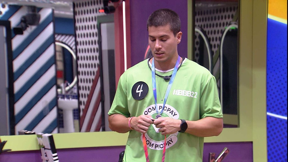 Arthur Aguiar ganha a Prova do Anjo (Foto: Reprodução)"Montro Cavalinho do Schmidt: foi dada a partida para o grande prêmio Big Brother Brasil 22. Enquanto a música estiver tocando, os castigados irão para o hipódromo montado no gramado e disputarão uma disputa emocionante com os cavalinhos de pau. A corrida só termina quando a música parar. E cada um deve permanecer o tempo inteiro com o seu cavalinho. Cada castigado perde 300 estalecas e quem estiver no Vip vai para a Xepa".