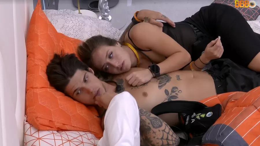 Gabriel e Bruna estavam deitados na cama do Quarto do Líder ao lado de Cara de Sapato, que confessou não sofrer com alergia.