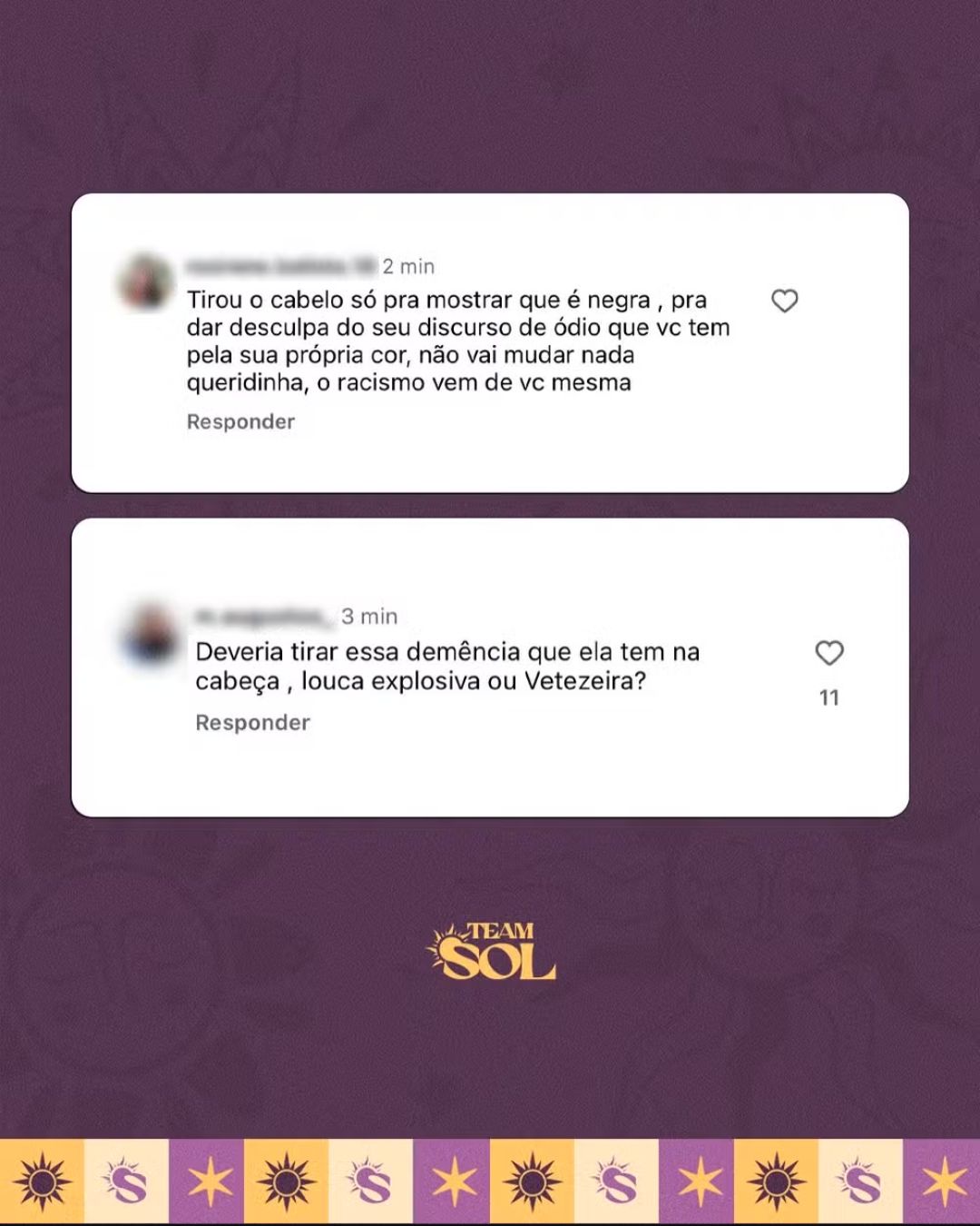 Estamos exaustos de as pessoas procurarem na Sol os problemas que estão nelas. Medidas judiciais serão tomadas frente aos comentários explicitamente preconceituosos que estão sendo feitos por aí, como se internet fosse terra sem lei", diz a nota publicada nas redes sociais.