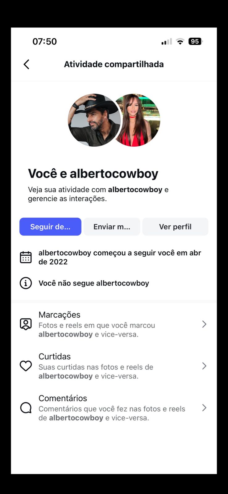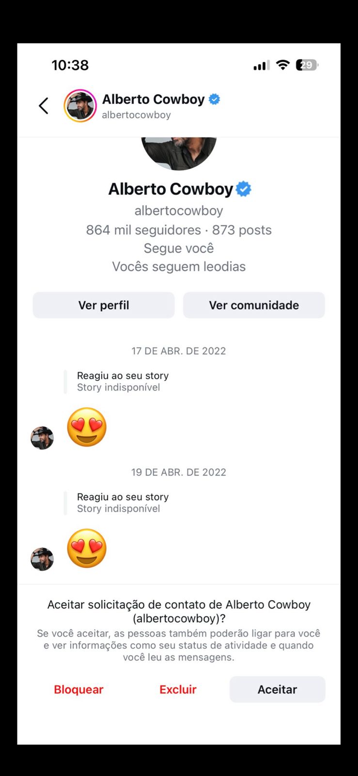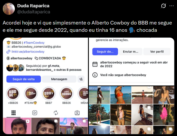 “Acordei hoje e vi que simplesmente o Alberto Cowboy do BBB me segue e ele me segue desde 2022, quando eu tinha 16 anos. Chocada”, escreveu ela na publicação que viralizou.