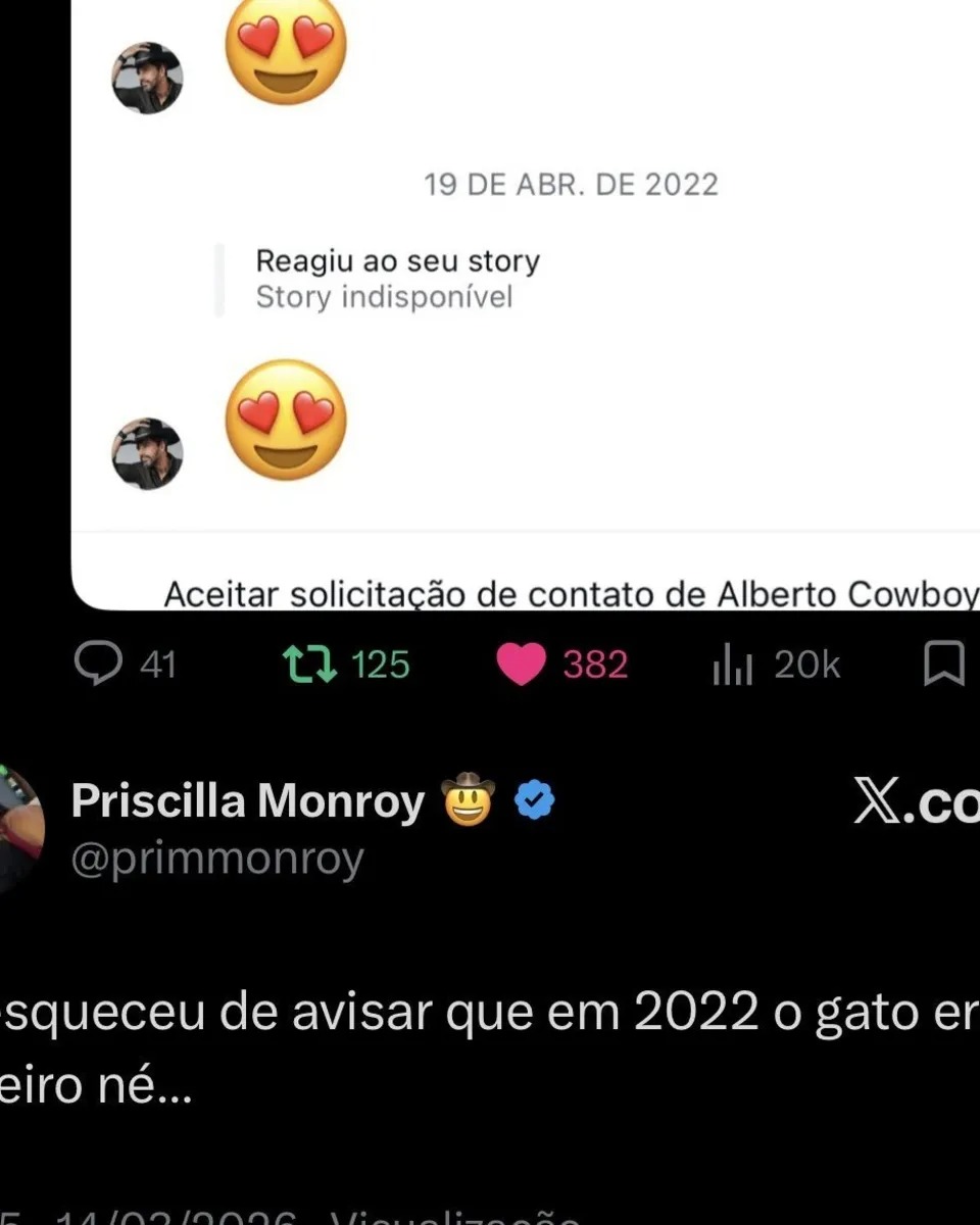 Diante da repercussão, Priscilla saiu em defesa do marido. “Só esqueceu de avisar que em 2022 o gato era solteiro, né…”, comentou. Pouco tempo depois, a mensagem foi apagada e o perfil dela acabou sendo fechado.