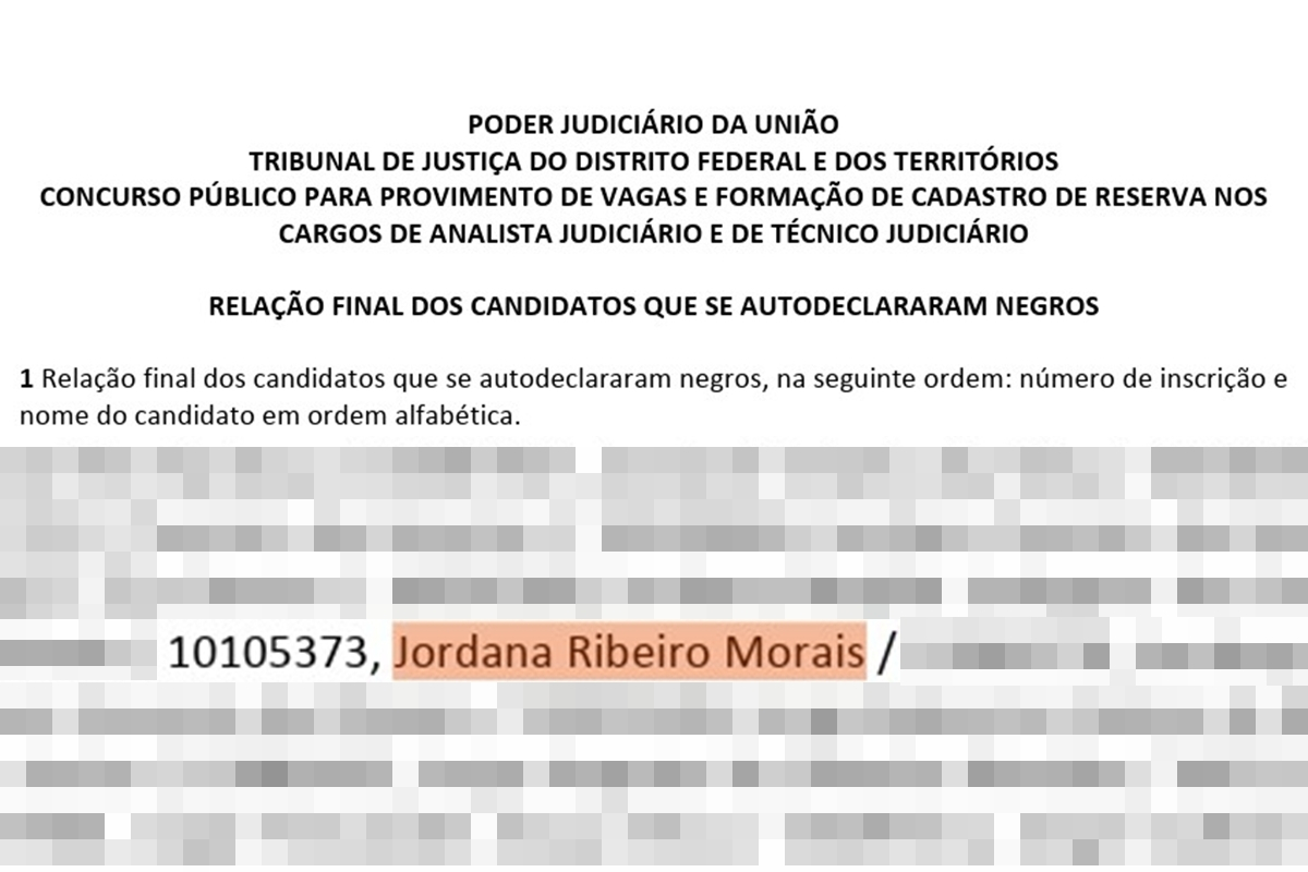 As acusações começaram a circular no X (antigo Twitter) e são acompanhadas da imagem de um documento do Centro Brasileiro de Pesquisa em Avaliação e Seleção e de Promoção de Eventos (Cebraspe). O material mostra o nome Jordana Ribeiro Morais na relação final de candidatos que se autodeclararam negros em um concurso realizado em 2015 pelo TJDFT.