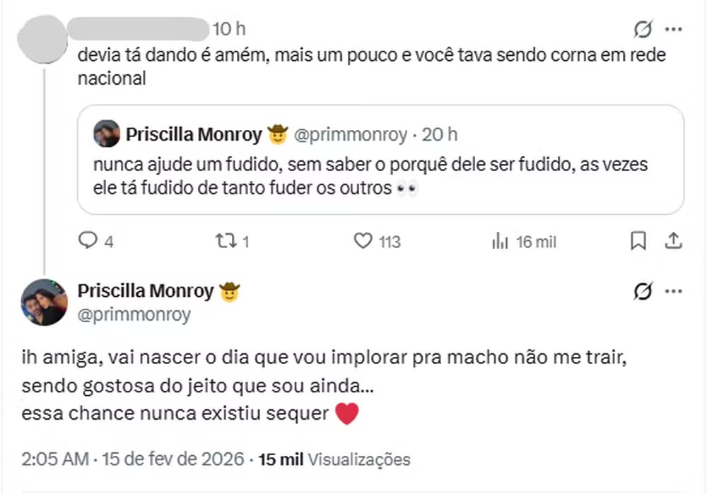 A troca começou depois que Priscilla publicou no X uma frase crítica sobre comportamento e ingratidão, logo após a dinâmica da casa em que Gabriela venceu a Prova do Anjo e colocou Cowboy no castigo do monstro. A decisão surpreendeu parte do público, já que os dois mantinham proximidade no jogo: