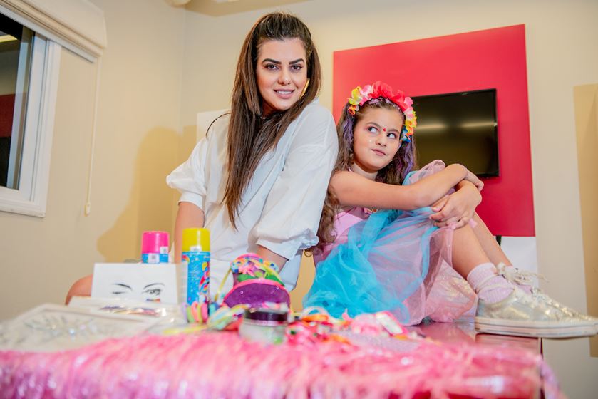 “Sou totalmente contra usar produtos de adultos em criança”, reforçou a mãe. As maquiagens aplicadas em Maria são veganas e o glitter é da Color Make, marca especializada em produções artísticas.