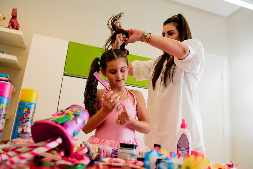 Nem só do look é feita a fantasia. As madeixas merecem uma atenção especial, principalmente das crianças. A dermatologista faz muitos penteados no cabelo de Maria, a pedido da menina, sobretudo nos dias de aulas escolares.