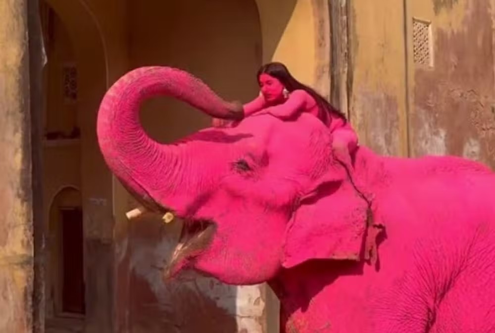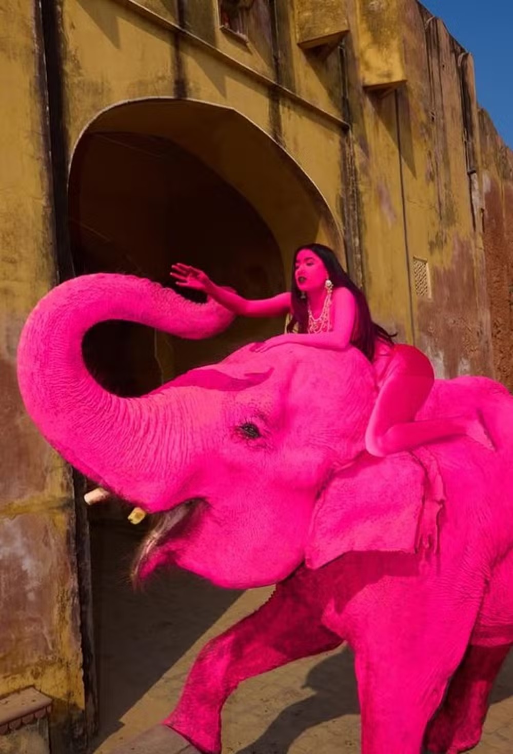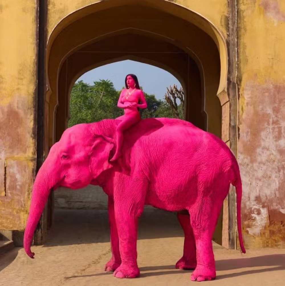 Elefanta 'rosa' usada em polêmico ensaio de influencer morre na Índia. Foto: Reprodução