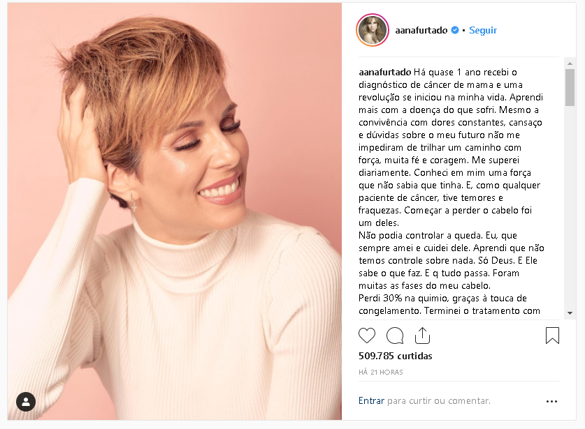 A apresentadora perdeu 30% dos pelos capilares na quimioterapia e usou tiras para manter o visual. No entanto, Ana Furtado precisa tomar um remédio, pelos próximos cinco anos, que inibe a produção de hormônios e diminui o crescimento do cabelo, o que a fez ressignificar a situação.