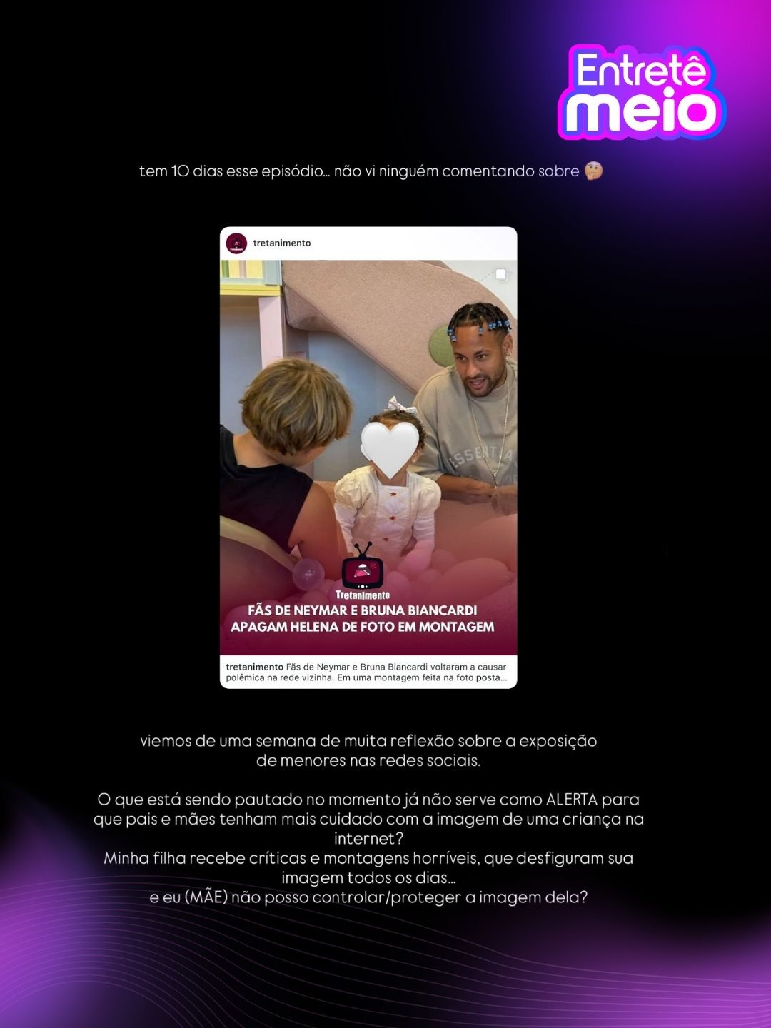 Viemos de uma semana de muita reflexão sobre a exposição de menores nas redes sociais. O que está sendo pautado no momento já não serve como ALERTA para que pais e mães tenham mais cuidado com a imagem de uma criança na internet? Minha filha recebe críticas e montagens horríveis, que desfiguram sua imagem todos os dias... e eu (MÃE) não posso controlar/proteger a imagem dela?