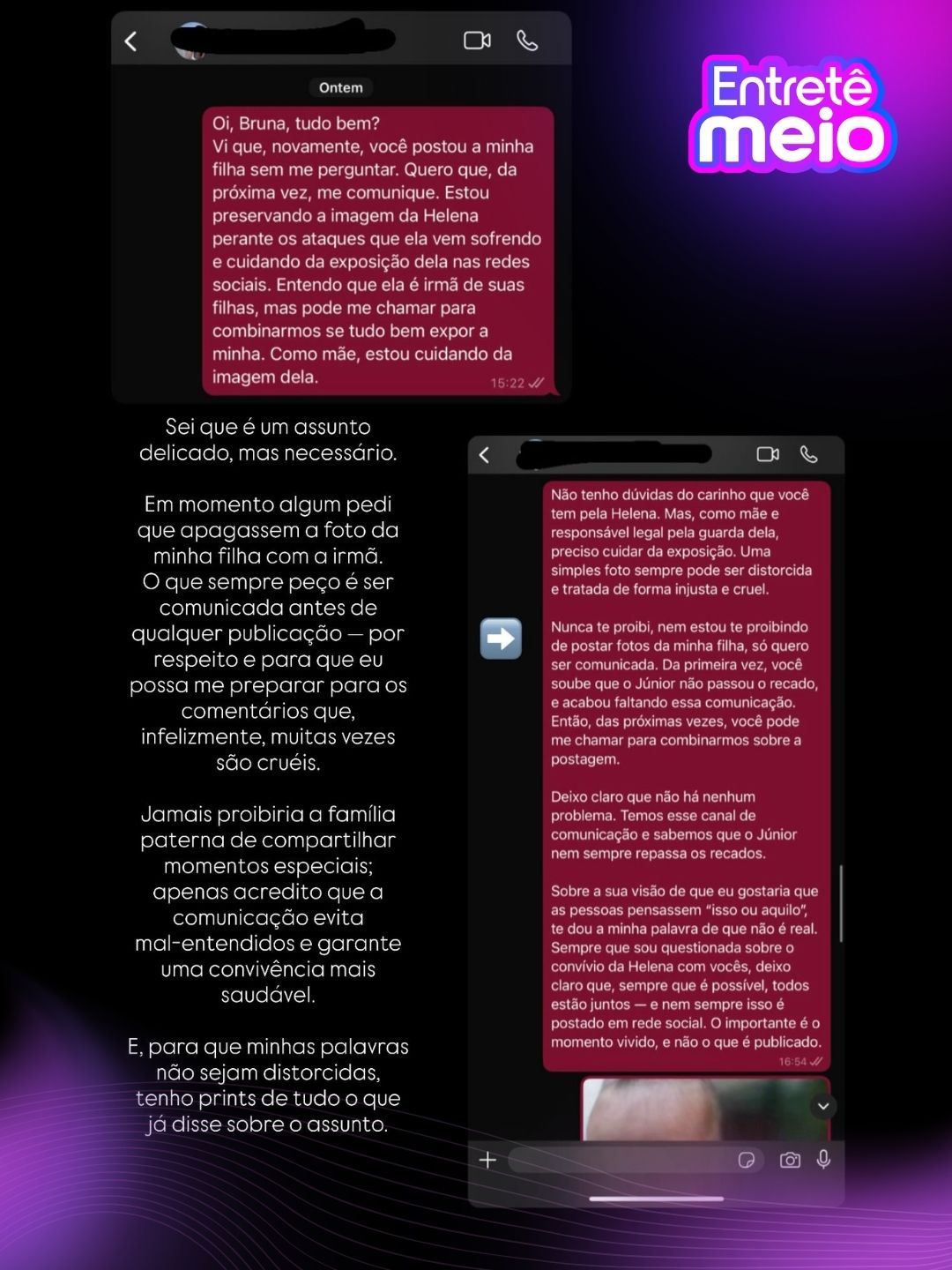 Jamais proibiria a família paterna de compartilhar momentos especiais; apenas acredito que a comunicação evita mal-entendidos e garante uma convivência mais saudável. Sempre tivemos um canal de comunicação respeitoso. Se a intenção é mostrar que a Helena faz parte do núcleo familiar, então também é importante mostrar que essa 'guerra' entre nós só existe na cabeça das pessoas.