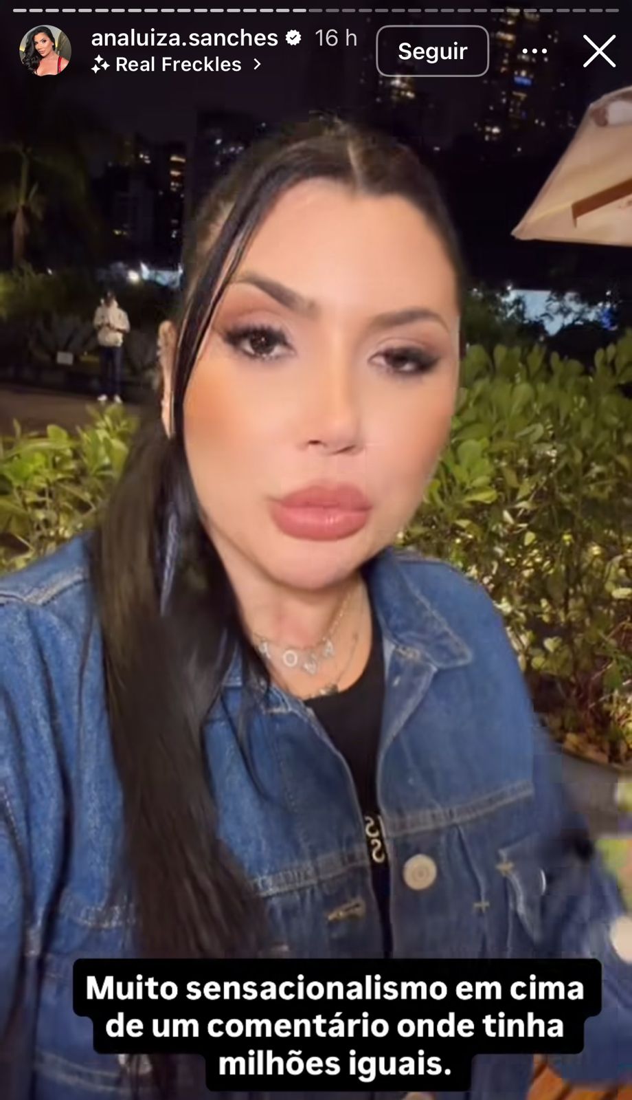Ana Luiza Sanches, amiga de Ana Castela, se manifestou após a repercussão de suas críticas à Virgínia, ela manteve sua opinião sobre o vídeo em que a influenciadora aparece cantando uma música de teor sexual, esclarecendo que “foi uma opinião como mulher”. Apesar disso, pediu que a polêmica não fosse direcionada à Boiadeira.
