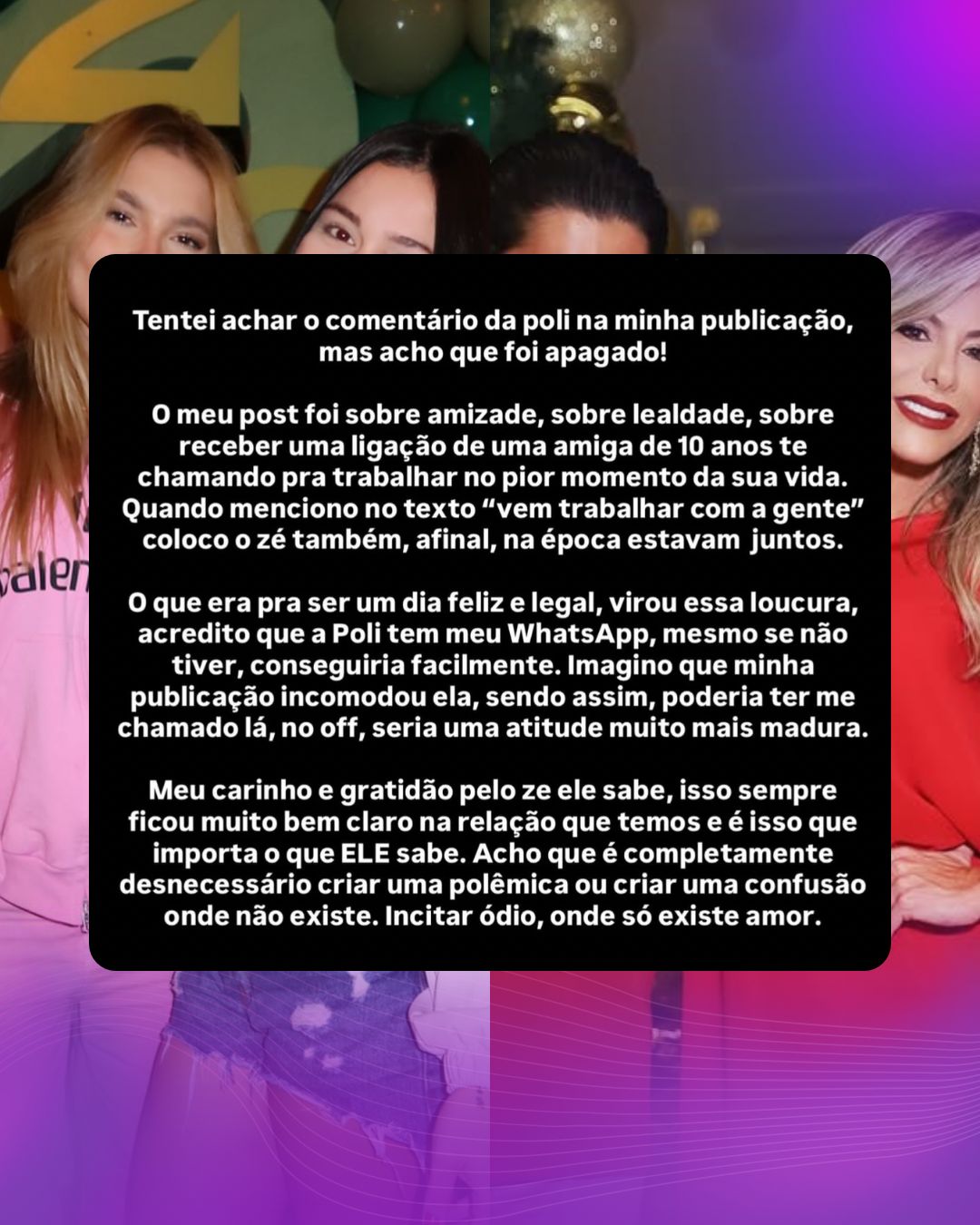 Em texto publicado neste sábado (2), Maressa explicou o contexto da postagem. “O meu post foi sobre amizade, sobre lealdade, sobre receber uma ligação de uma amiga de 10 anos te chamando para trabalhar no pior momento da sua vida. Quando menciono no texto ‘vem trabalhar com a gente’, coloco o Zé também, afinal, na época estavam juntos”, escreveu ela.