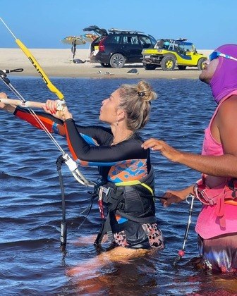 Na terça-feira (2), a atriz quis aprender o esporte do namorado e se arriscou em uma aula de kitesufe.