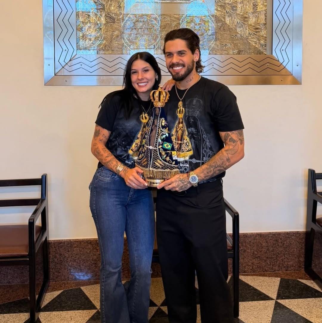 Ana Castela e Zé Felipe visitam Aparecida, tocam imagem da santa e recebem bênção. Foto: Reprodução