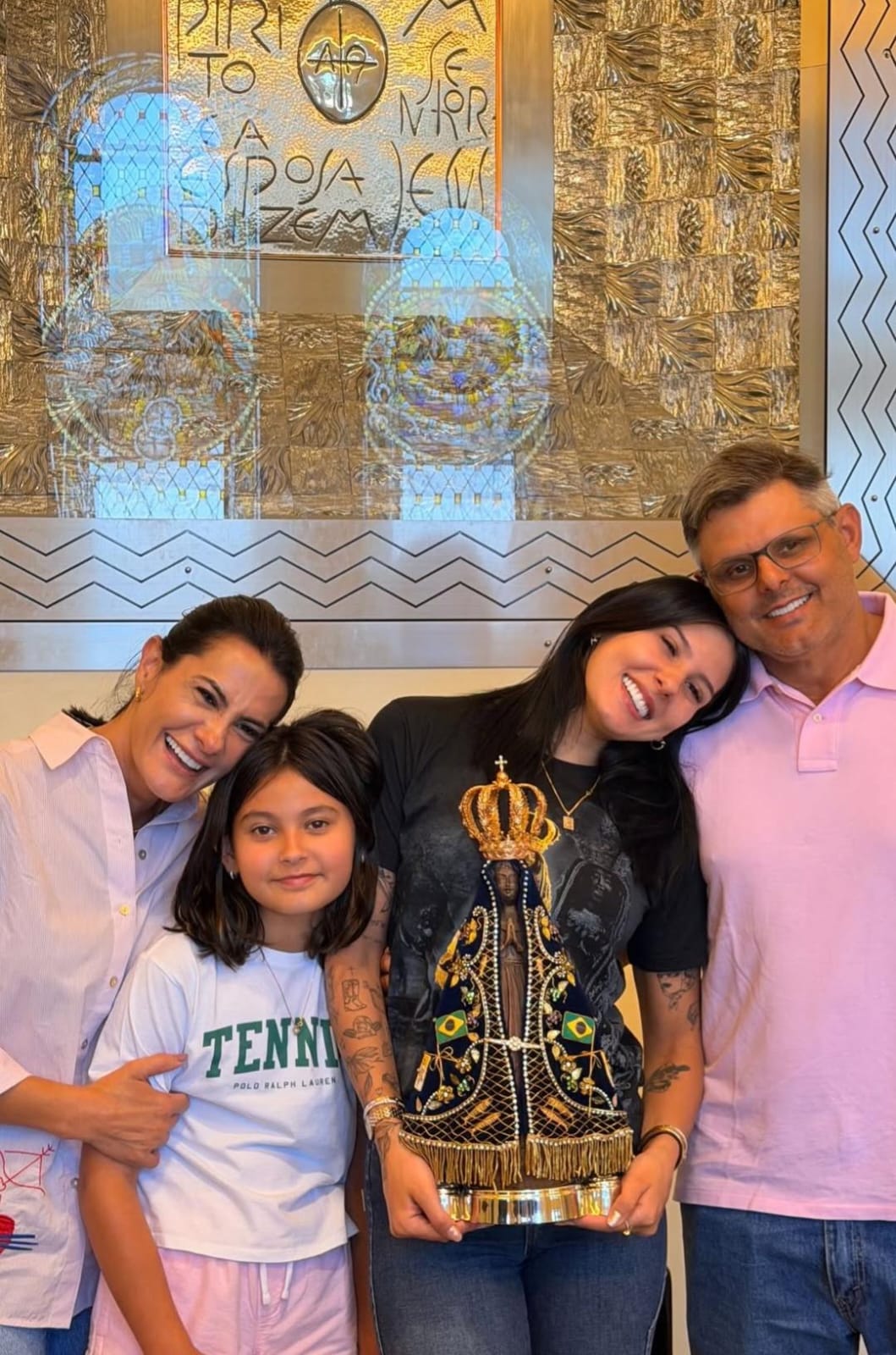 Ana Castela esteve acompanhada dos pais, Michele e Rodrigo, e da irmã mais nova, Antonella, de 11 anos. Em um gesto simbólico, a artista deixou um chapéu na Sala das Promessas, espaço dedicado a objetos que representam testemunhos de fé dos devotos.