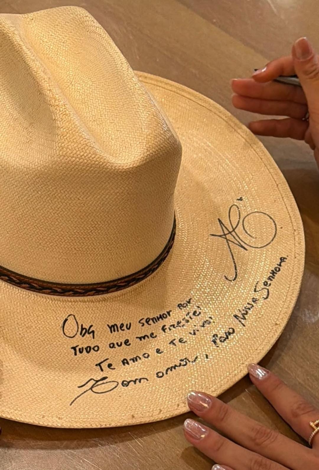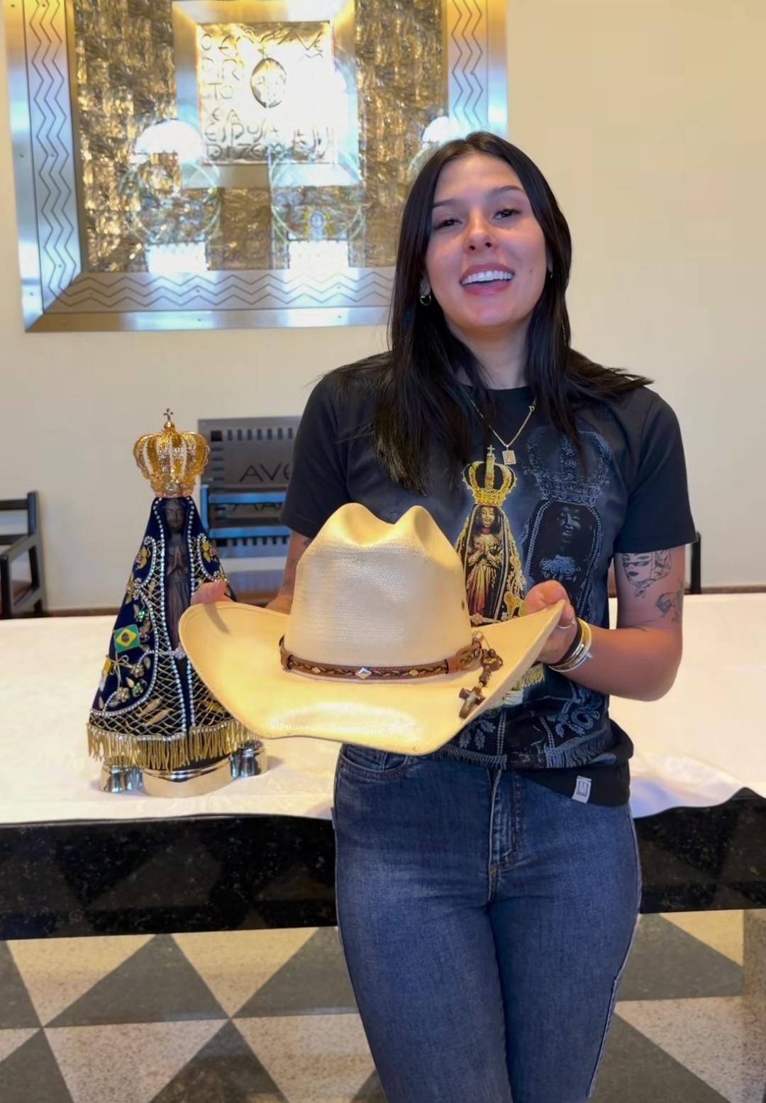 Ana Castela e Zé Felipe visitam Aparecida, tocam imagem da santa e recebem bênção. Foto: ReproduçãoNas redes sociais, a cantora explicou o valor sentimental do chapéu, que ganhou da avó e passou a usar desde o início da carreira. “Quem me acompanha desde o comecinho sabe a importância desse chapéu para mim. Comprei com a minha avó no Paraguai e, desde então, ele me acompanhou em tudo”, contou.