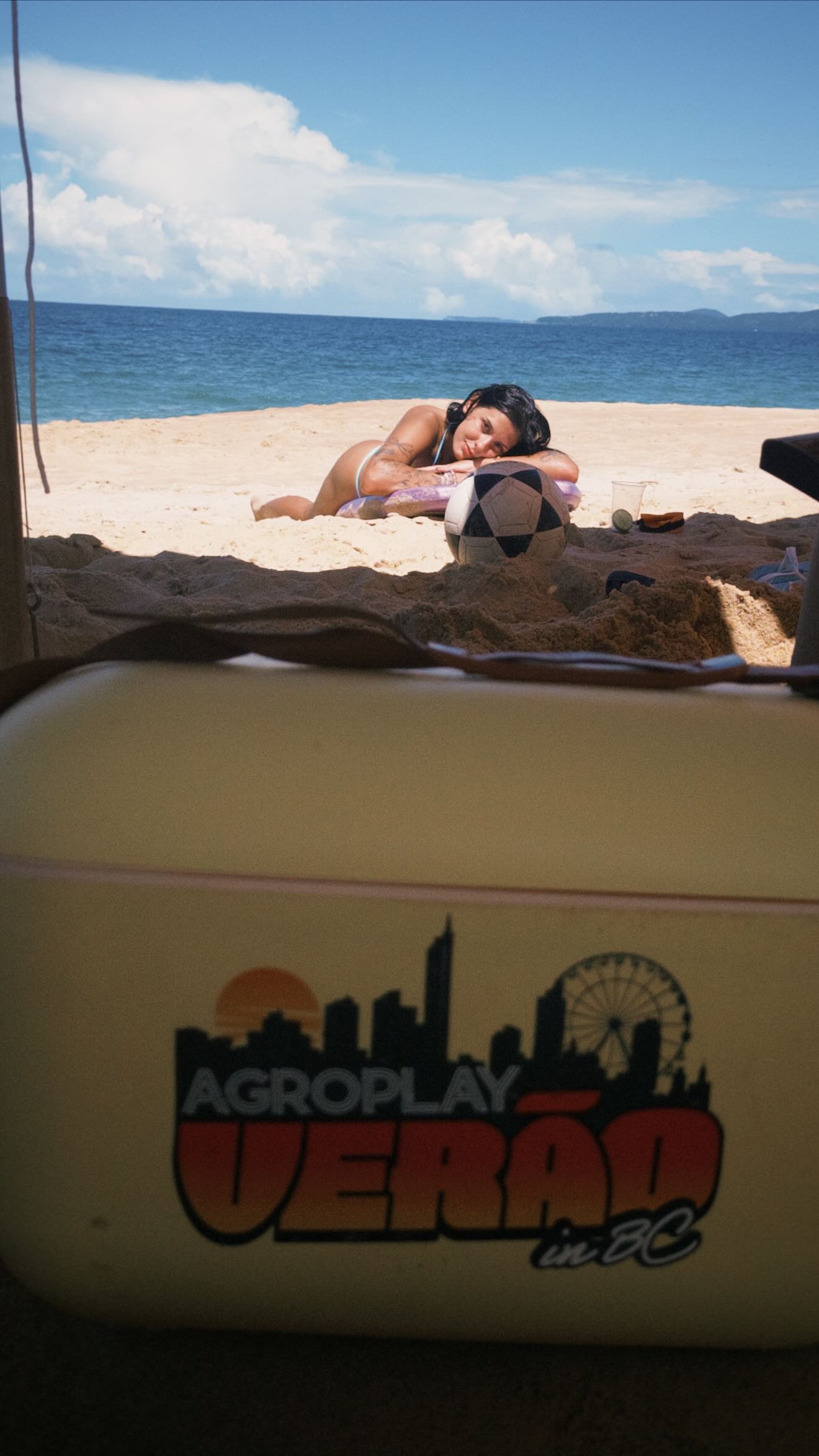 A Boiadeira ainda estava segurando uma bola de futebol com um sorriso exibindo bom-humor. Ao fundo, havia uma piscina e uma placa com o nome de seu novo projeto Agroplay Verão.