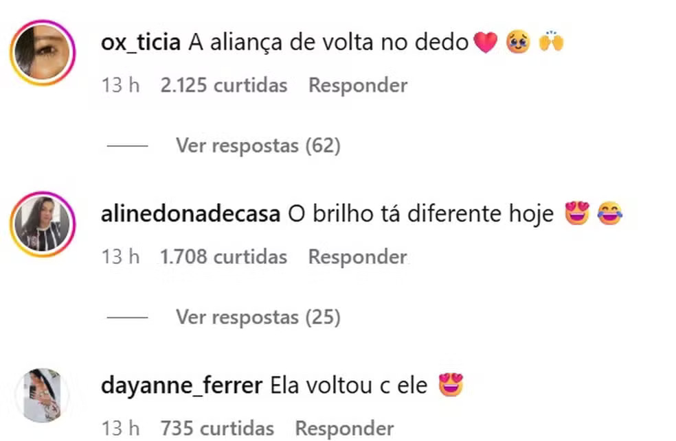 A aparição da aliança acontece um dia após a participação de Zé Felipe no evento. Nos comentários, seguidores levantaram a hipótese de uma reconciliação, embora nenhuma informação tenha sido confirmada publicamente pelos artistas até o momento.