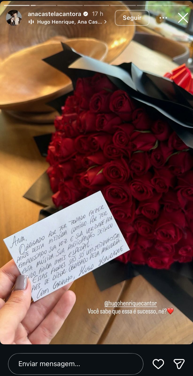 Além das flores, Hugo Henrique enviou um cartão com uma mensagem direcionada à cantora. “Obrigado por ter topado fazer parte dessa história comigo. Por ter emprestado sua voz e sua verdade para esta música”, diz o texto.