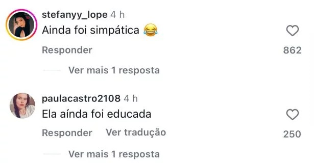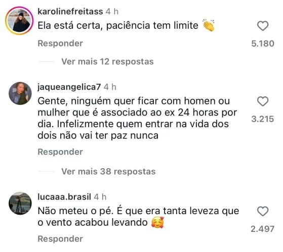 “Ninguém aguenta ser ligado ao ex o tempo todo”, opinou outra. Teve ainda quem levasse a situação na brincadeira: “Não meteu o pé, foi tanta leveza que o vento levou”. “E ainda assim foi educada”, comentou mais um usuário.