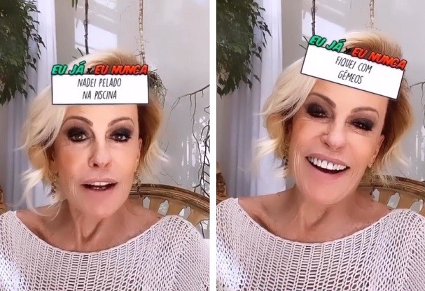 Ana Maria Braga compartilhou um vídeo em que aparece usando um filtro do Instagram para brincar de Eu Nunca. "Só besteira", escreve na legenda. Logo de cara, a apresentadora disse que já nadou pelada na piscina, mas que nunca ficou com gêmeos, mandou indireta nos Stories ou mentiu o nome para alguém. "Para que?", questionou. As informações são da Revista Glamour.