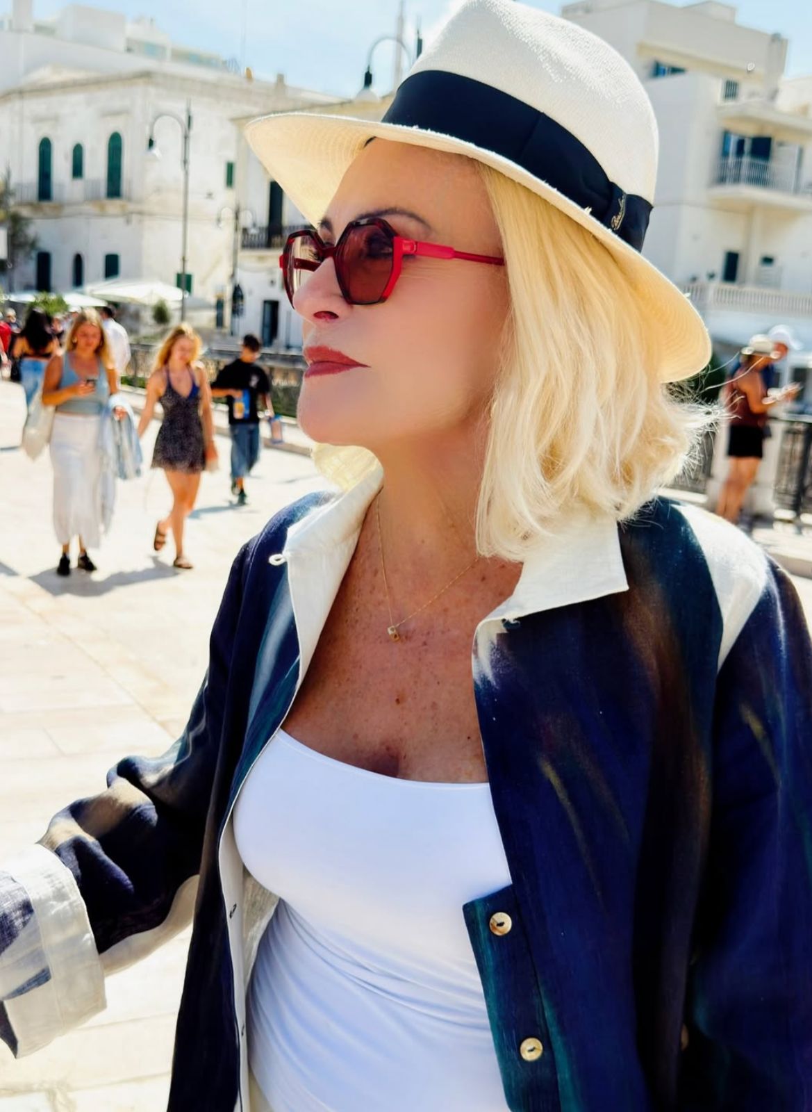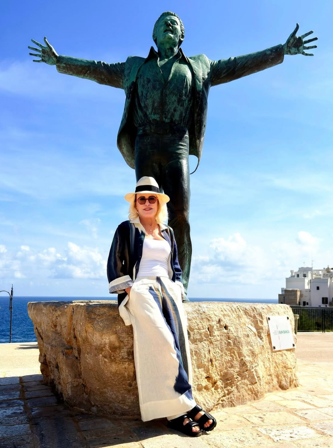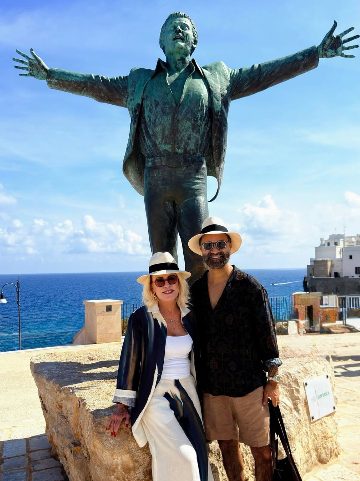 “Aqui em Polignano a Mare o sol parece que brilha diferente… O clima abraça a gente mesmo. E olha que curioso: foi aqui que nasceu Domenico Modugno, o cantor de Volare. Tem até uma estátua dele de braços abertos para o mar, como se cantasse junto com o azul desse marzão maravilhoso”, escreveu a apresentadora em suas redes sociais.