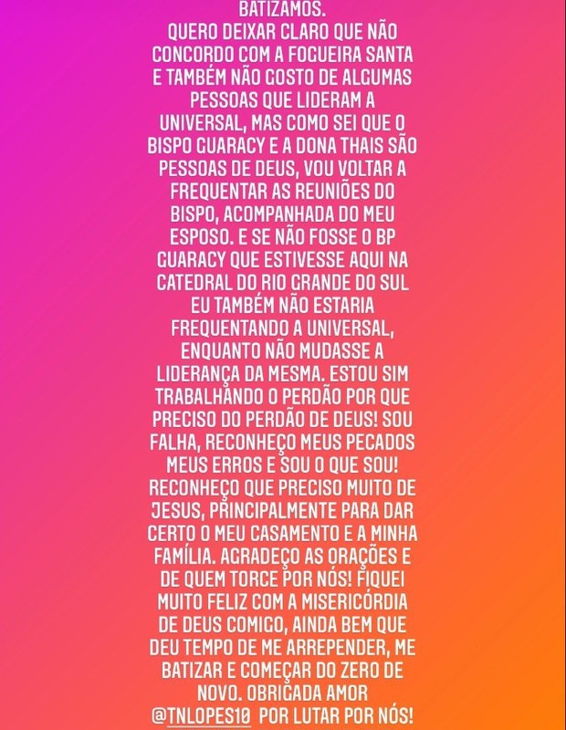 "Estou sim trabalhando o perdão porque preciso do perdão de Deus. Sou falha, reconheço meus pecados, meu erros e sou o que sou. Reconheço que preciso muito de Jesus, principalmente para dar certo o meu casamento e a minha família. Agradeço as orações e de quem torce por nós. Fiquei muito feliz com a misericórdia de Deus comigo, ainda bem que deu tempo de me arrepender, me batizar e recomeçar do zero de novo. Obrigada, amor por lutar por nós! E obrigada Bispo Guara Santos, por orientar meu esposo a não desistir da nossa família", completou.