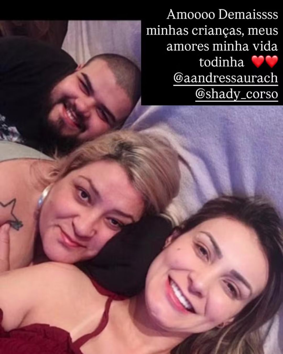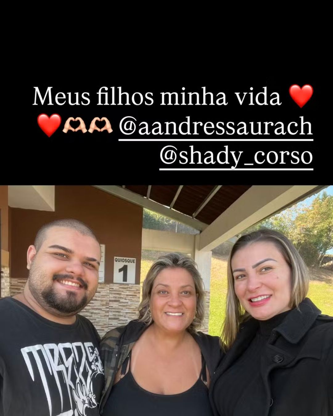 Nas publicações, Marisete compartilhou registros de Andressa bem diferente do visual atual, incluindo cliques raros com o irmão mais novo, Vinicius Corso, de 24 anos. A influenciadora também apareceu com o filho mais velho, Arthur Urach, de 20 anos, que segue carreira como DJ e já trabalhou como câmera em produções adultas estreladas pela mãe.