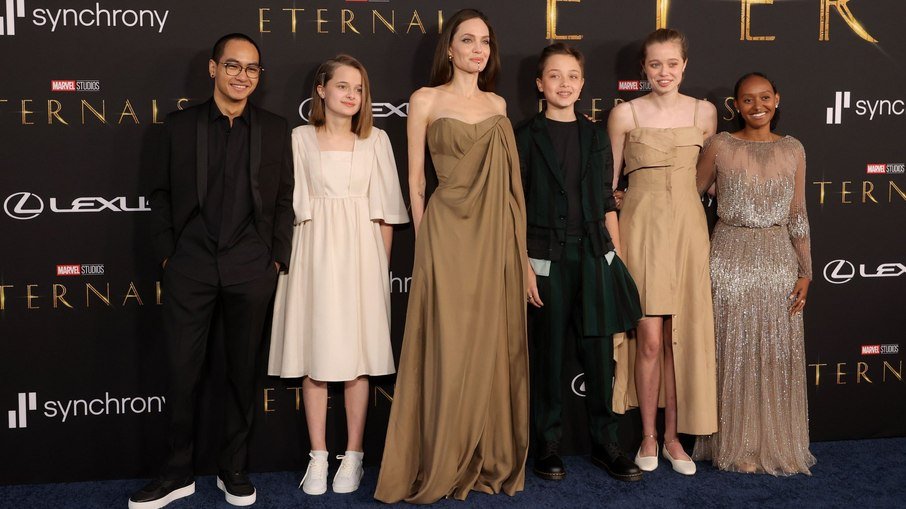 Atriz Angelina Jolie ao lado dos filhos na première do filme Eternos (Foto: Divulgação)Na noite desta quinta-feira (18), a atriz posou com cinco de seus seis filhos com o também ator Brad Pitt: Maddox, de 20 anos, Vivienne e Knox, de 13, Zahara, de 16, e Shiloh, de 15. O único que não esteve com a atriz no evento foi Pax, de 17 anos.