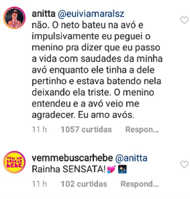 "O neto bateu na avó e, impulsivamente, eu peguei o menino para dizer que passo a vida com saudades da minha avó enquanto ele tinha a dele pertinho e estava batendo nela, deixando ela triste. O menino entendeu e a avó veio me agradecer. Eu amo avós", escreveu.