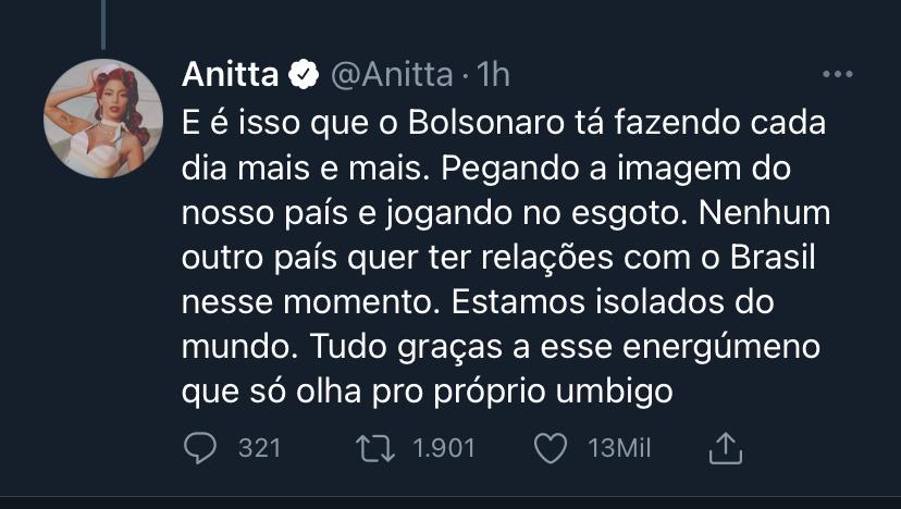 Anitta usa as redes sociais para criticar Bolsonaro |
