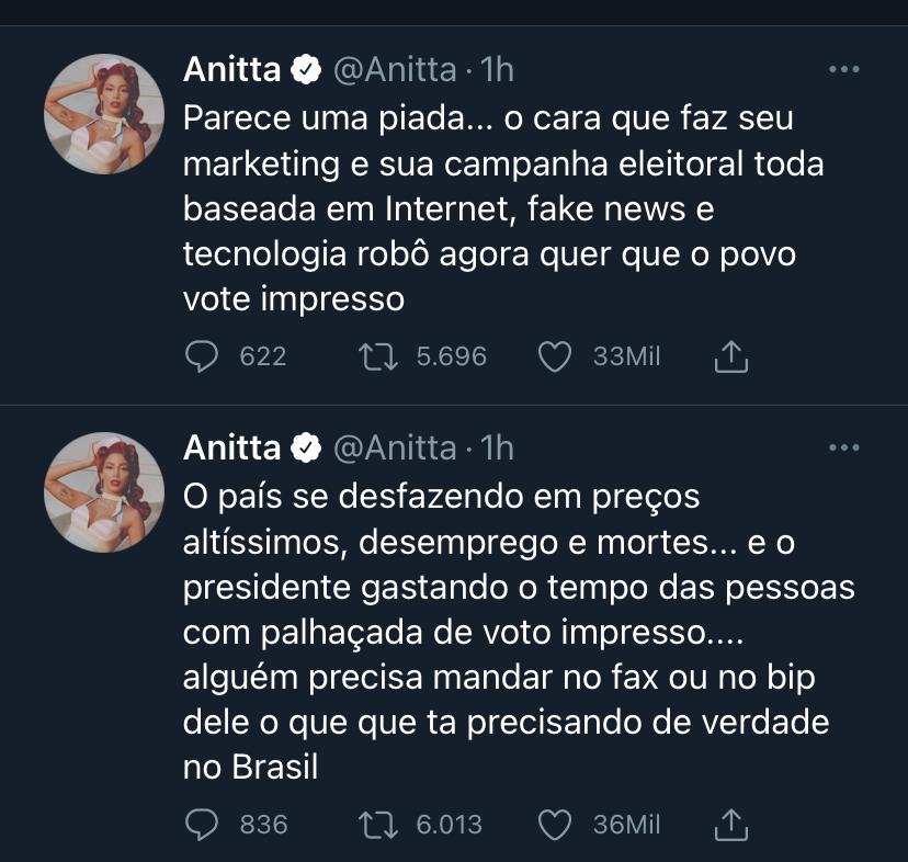 Anitta também usou as redes sociais para descrever a atual situação econômica e social do Brasil. "O país se desfazendo em preços altíssimos, desempregos e mortes... e o presidente gastando tempo com essa palhaçada de voto impresso", disse.