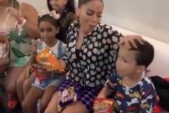 Nos bastidores, um episódio da cantora no camarim chamou a atenção de alguns internautas. Enquanto se deliciava com salgadinhos de uma das marcas patrocinadoras do evento ao lado de seus sobrinhos Letícia e Breno, Anitta acabou fazendo um carinho na cabeça de Breno com a mão suja de farelo.