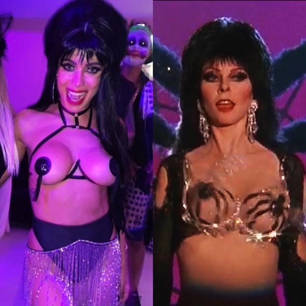 Anitta não cansa de surpreender, né?! A cantora, que abriu sua mansão, na noite de quarta-feira (30), para uma festa de Halloween repleta de famosos e familiares, se fantasiou de Elvira, do filme Elvira: A Rainha das Trevas, de 1988. Porém, madrugada adentro, a cantora decidiu ousar ainda mais no visual e ficou com um look de seios à mostra, hot pants e uma msaia supertransparente de franjas. O look também faz parte de uma das cenas do filme, um clássico do terrir (terror com humor). As informações são da Revista Quem.