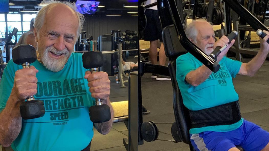 Ary Fontoura provou que tem muita garra aos 86 anos. O ator publicou em seu Instagram fotos em que aparece fazendo musculação em uma academia, todo sorridente.