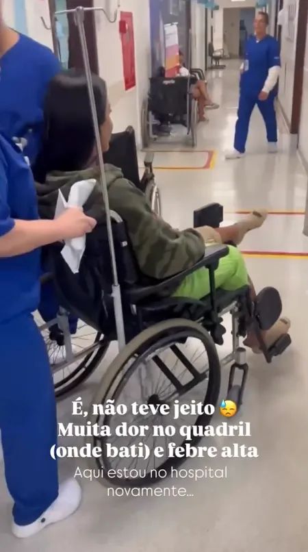 “É, não teve jeito. Muita dor no quadril (onde bati) e febre alta. Aqui estou no hospital novamente”, escreveu em um vídeo publicado nos stories do Instagram, onde aparece circulando de cadeira de rodas pela clínica.