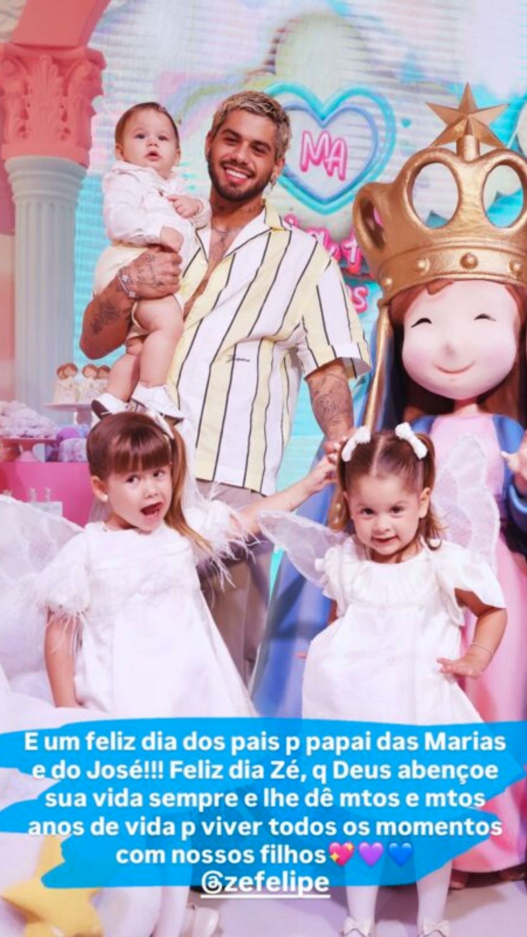 Virginia Fonseca prestou uma homenagem ao ex-marido, o cantor Zé Felipe, neste domingo (10/8), Dia dos Pais, em suas redes sociais. Mãe dos três filhos do artista, ela escreveu uma mensagem carinhosa, desejando bênçãos e longevidade para que ele possa acompanhar os momentos com as crianças.