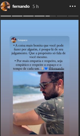 "A coisa mais bonita que você pode fazer por alguém é poupá-lo de seu julgamento, que a propósito, só fala de você mesmo. Por mais empatia e respeito, seja empático e respeite o espaço e o tempo de cada um", diz o texto compartilhado por Fernando.