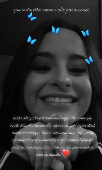 "Que todo esse amor volte para vocês. Muito obrigada por toda mensagem de amor que vocês estão me mandando. Eu nunca quis expor essas coisas na internet, mas se tem uma coisa que venho aprendendo é que mostrar nossas vulnerabilidades pode ser revolucionário e tem poder de mudar pra vida de alguém", escreveu a adolescente, de 18 anos. Mais cedo ela contou que Fernando não é um pai presente.