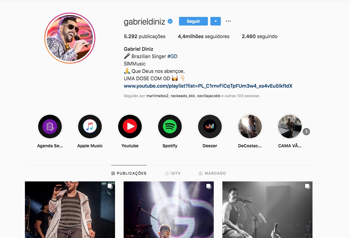 Na tarde de ontem (27), após a confirmação da morte do cantor Gabriel Diniz, sua conta oficial no Instagram tinha pouco mais de 3,5 milhões de seguidores. Este número já chegou a 4.261.564 milhões de seguidores em menos de dez horas. Do fim de 2018 para cá, a vida de Gabriel Diniz mudou com o estouro de "Jenifer", que acabou sendo alçada ao posto de hit do verão. As informações são do Extra.