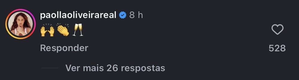 Mesmo após o anúncio, a interação entre os dois reacendeu especulações nas redes sociais e gerou comentários de fãs que torcem por uma reconciliação. “Voltem, Paolla!”, escreveu um seguidor. “Se estão bem separados, maravilha. Mas, se a situação tiver solução, voltem. Vocês são muito lindos juntos”, comentou outra admiradora.