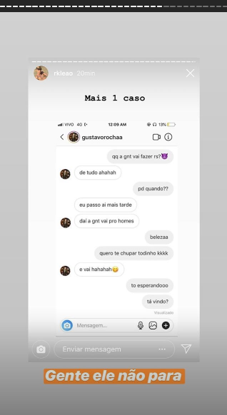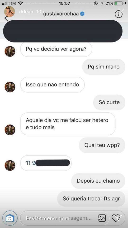 “Sobre falar que preciso provar que não sou uma pessoa ruim, não é a questão da sexualidade. É que eu estou tendo que provar que não sou mentiroso, porque o menino está fazendo eu me passar por mentiroso”, finalizou Gustavo Rocha, mudando de assunto imediatamente. Posteriormente, o ator pornô surpreendeu e publicou novos prints comprometedores.