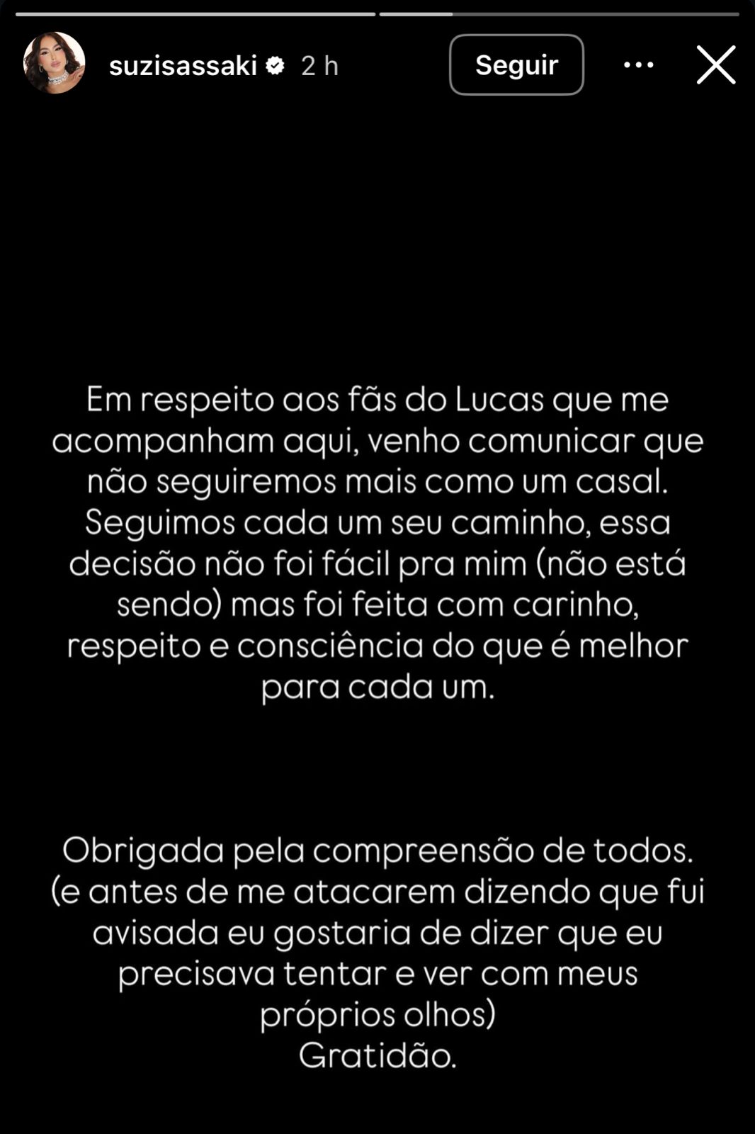 “Em respeito aos fãs do Lucas que me acompanham aqui, venho comunicar que não seguiremos mais como um casal. Seguimos cada um seu caminho, essa decisão não foi fácil pra mim (não está sendo) mas foi feita com carinho, respeito e consciência do que é melhor para cada um. Obrigada pela compreensão de todos. (e antes de me atacarem dizendo que fui avisada eu gostaria de dizer que eu precisava tentar e ver com meus próprios olhos) Gratidão”, disse.