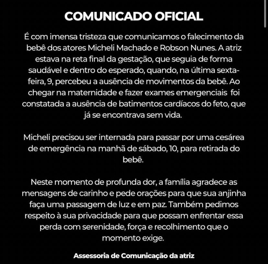 "É com profunda tristeza que divulgamos o falecimento do bebê dos atores Micheli Machado e Robson Nunes. A atriz, que estava em estágio final de sua gravidez, percebeu a ausência de movimentos fetais na sexta-feira passada. Ao chegar à maternidade para um atendimento de urgência, foi constatado que não havia batimentos cardíacos, indicando que o bebê havia falecido. Micheli foi internada para a realização de uma cesariana de emergência no sábado, dia 10, para dar à luz o bebê. A família agradece as mensagens de apoio e orações recebidas neste momento difícil, e pede que sua privacidade seja respeitada enquanto vivem o luto", informou a nota assinada pela assessoria de comunicação da atriz.