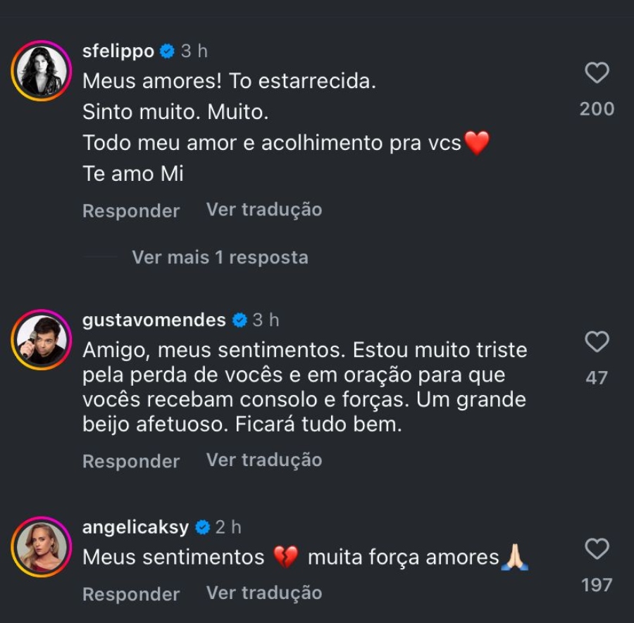 O casal, que anunciou a gestação em fevereiro deste ano, recebeu muitas mensagens de força e carinho dos amigos. "Sintam o meu amor, meu abraço, que Deus conforte os seus corações", postou a atriz Cacau Protásio. "Meus sentimentos! Muita força, amores!", escreveu a apresentadora Angélica. "Todo o meu amor pra vocês! Eu sinto muito", postou a atriz Jeniffer Nascimento. "Sinto muito. Vibrando muito amor para vocês", escreveu a atriz Bárbara Borges.
