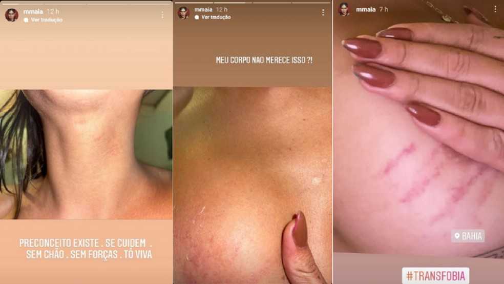 Em seu perfil nas redes sociais, Marcella disse ue foi alvo de transfobia e mostrou hematomas na região do pescoço, ombro e seio.