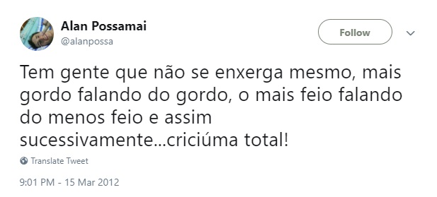 "Tem gente que não se enxerga mesmo: mais gordo falando do gordo, o mais feio falando do menos feio e assim sucessivamente. Criciúma total!", tuitou o jovem, também em março de 2012.