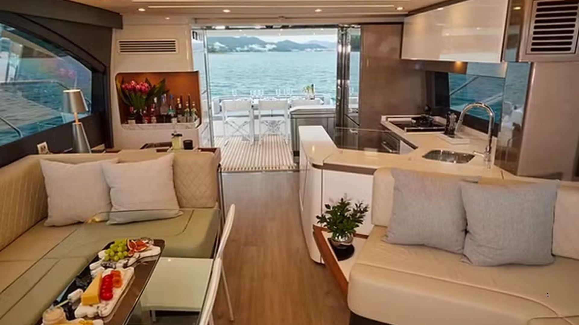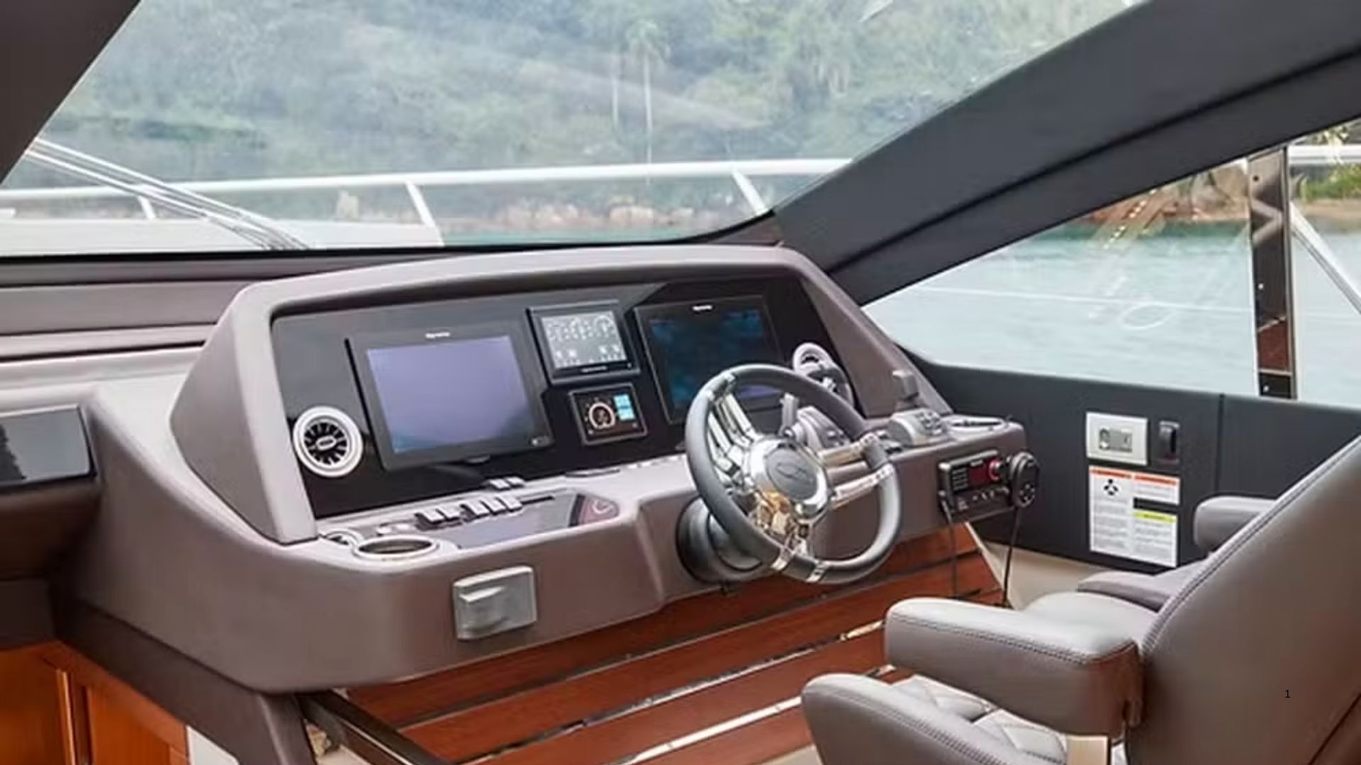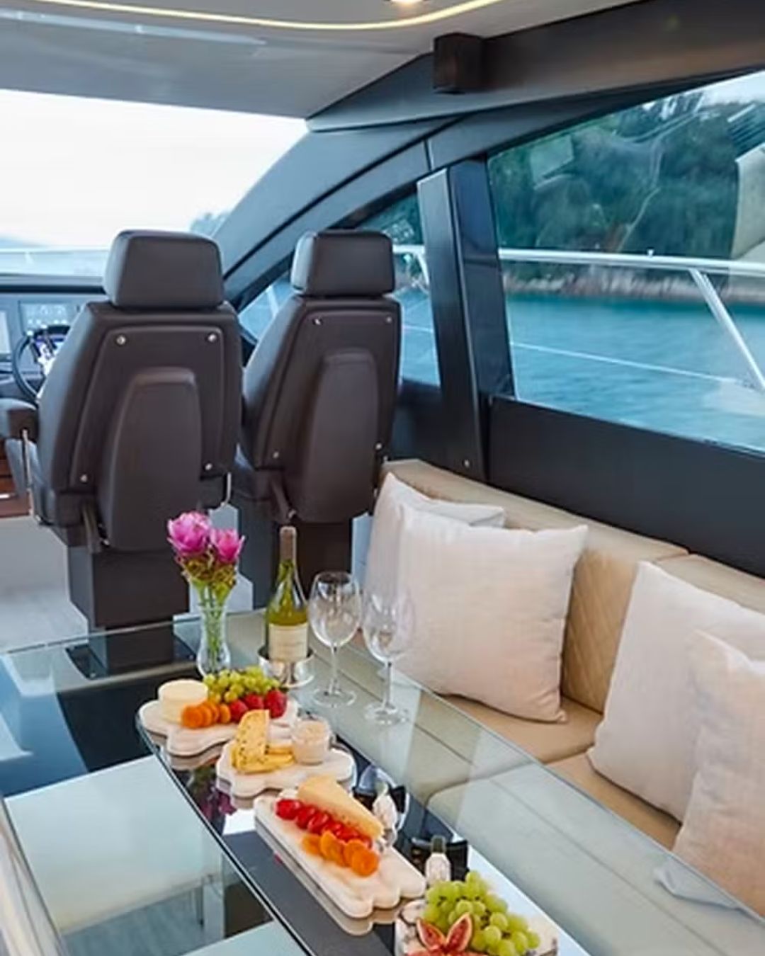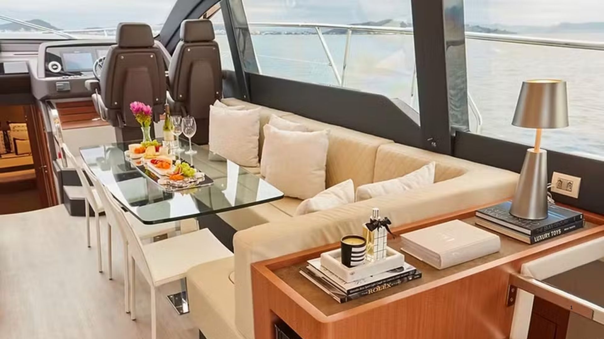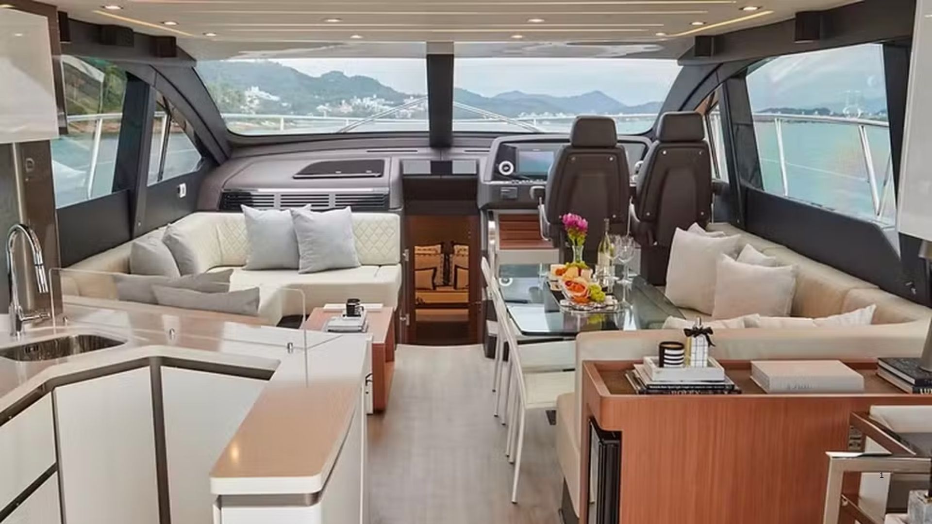 As plataformas laterais da lancha se abrem hidraulicamente, ampliando a popa de 5,5 metros para 6,41 metros e criando uma área de lazer ainda maior. O convés principal, sem degraus, facilita o acesso e oferece sensação de amplitude, com uma porta de vidro que se abre totalmente para integrar o interior ao ambiente externo.