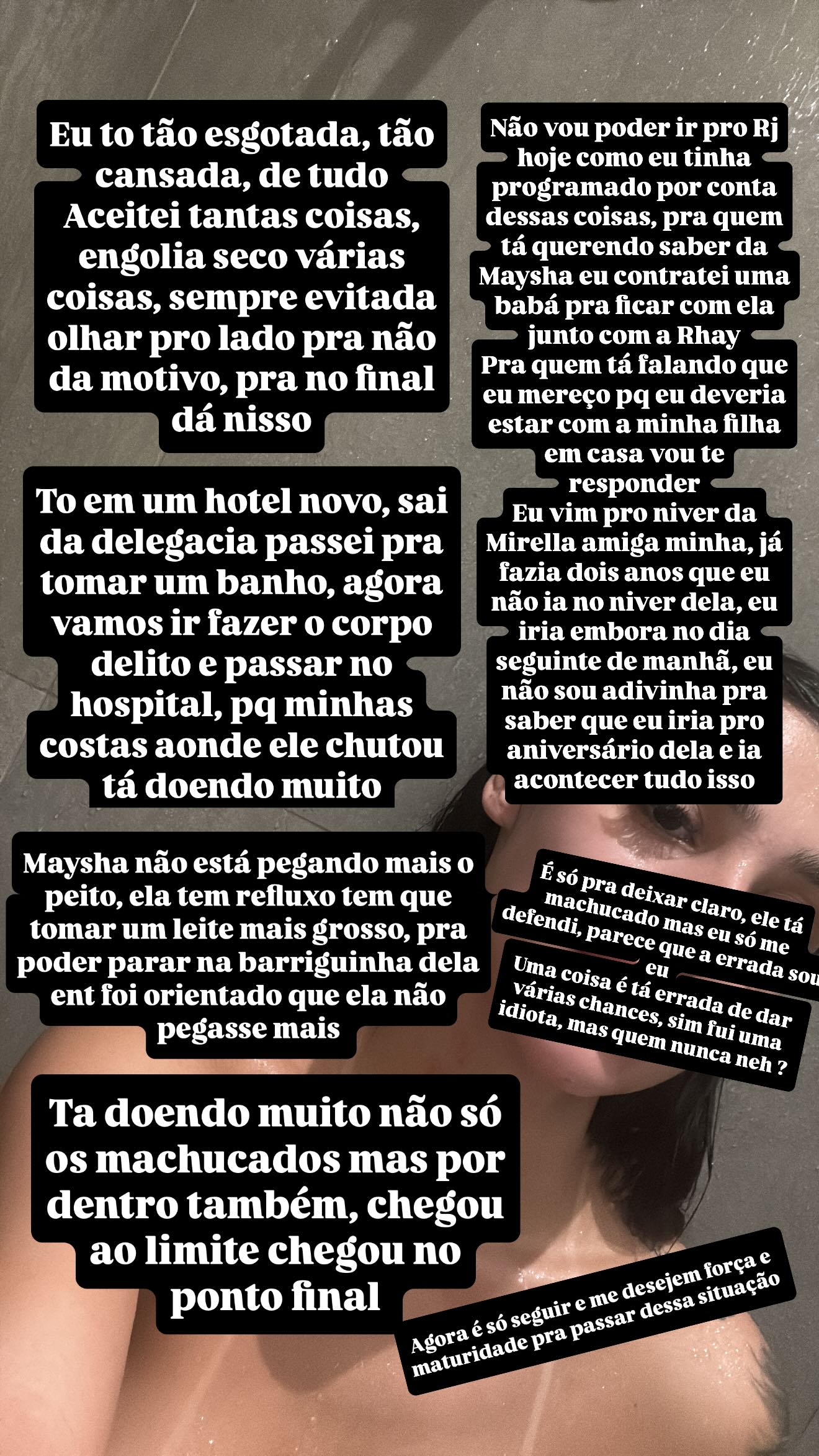 “Eu tô tão esgotada, tão cansada de tudo, aceitei tantas coisas, engolia em seco várias coisas. Sempre evitava olhar pro lado pra não dar motivo, pra no final dar nisso”, desabafou.