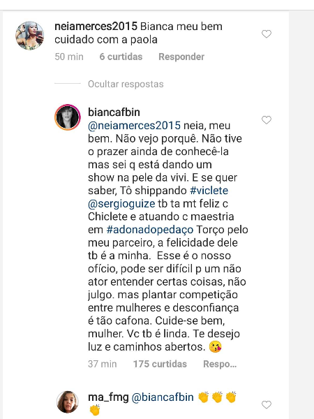 "Meu bem, não vejo porquê. Não tive o prazer ainda de conhecê-la, mas sei que está dando um show na pele da Vivi. E se quer saber, estou shippando 'Viclete' [união dos nomes dos personagens, Vivi e Chiclete]", disse Bianca.